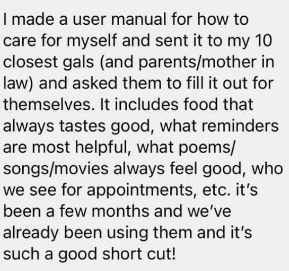 Earlier this week, I used my Instagram Stories to ask for specific examples of exactly what we’re talking about here: ways they asked or offered help within their close or loose community. You can look at some of the responses here, but the one that incited the most responses from others involved a response from a reader named Brenna, who told me about her “Guide to Me”/ “Emergency Guide”