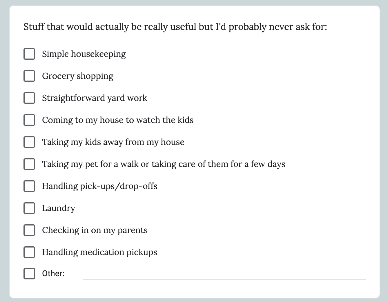 A form might seem clinical, but I find that the remove allows people to answer honestly in a way they might not if, say, you were asking them these questions in person. It also helps us move away from the dead-end of “let me know if there’s anything I can do,” which, for various cultural and inter-personal reasons, most often results in no one asking or doing anything. Instead, you have prompts like this: