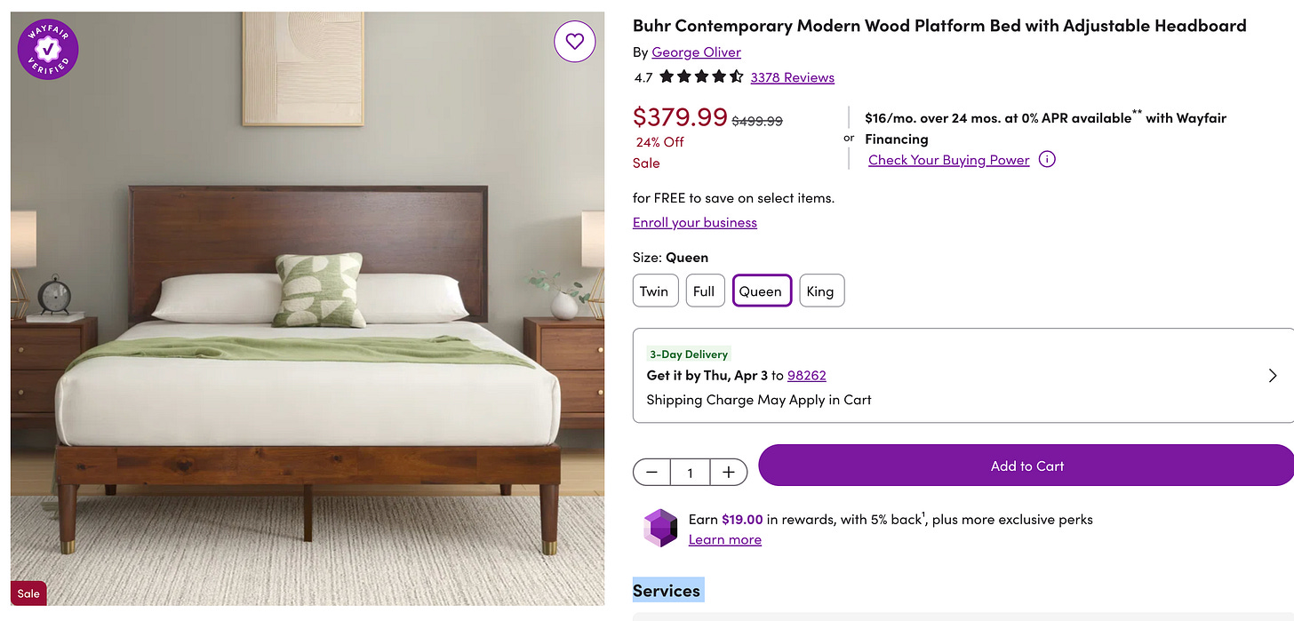 Last month, a friend of mine who we’ll call Jane bought a nice mid-century modern bedframe from Wayfair. She was moving into a place of her own and had to buy several items to outfit the space, so she decided to spend more on the couch and less on the bedframe. Wayfair’s looked nice, the reviews were good, and best of all, they didn’t charge for shipping.