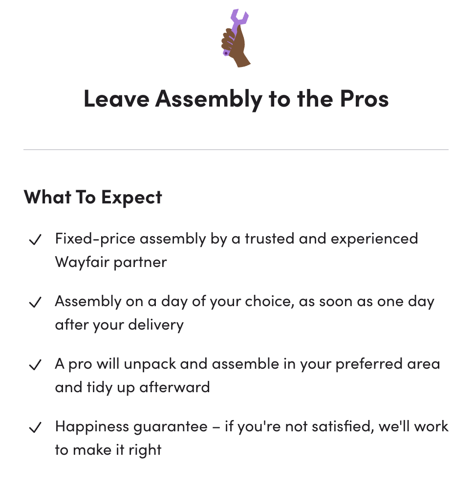 Sounds GREAT. The FAQ explains that the assembly will be performed by an “assembly pro” from “one of our trusted partners, Wayfair Home Services or Angi.” Assemblers are “background-checked and highly rated by customers.” All you have to do is add-on assembly when you buy the bed, then schedule it using the app.