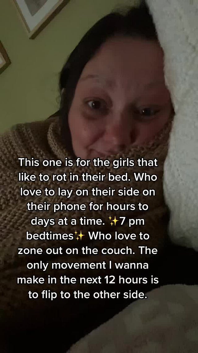 There’s a lot to peruse under the hashtag; you could write a dissertation on how different users are countering it, texturing it, contextualizing it. (See: “Nurses invented bedrotting”). And in a repeat of last year’s discourse around Quiet Quitting, the “trend” has become a site of panic, condescension, or blame: the New York Post declared “Why ‘bed rotting’ is the newest hot self-care trend for lazy Gen Zers,” Well + Good warned about how it can mess with your sleep, House Beautiful wondered if it’s “really” a form of self-care.