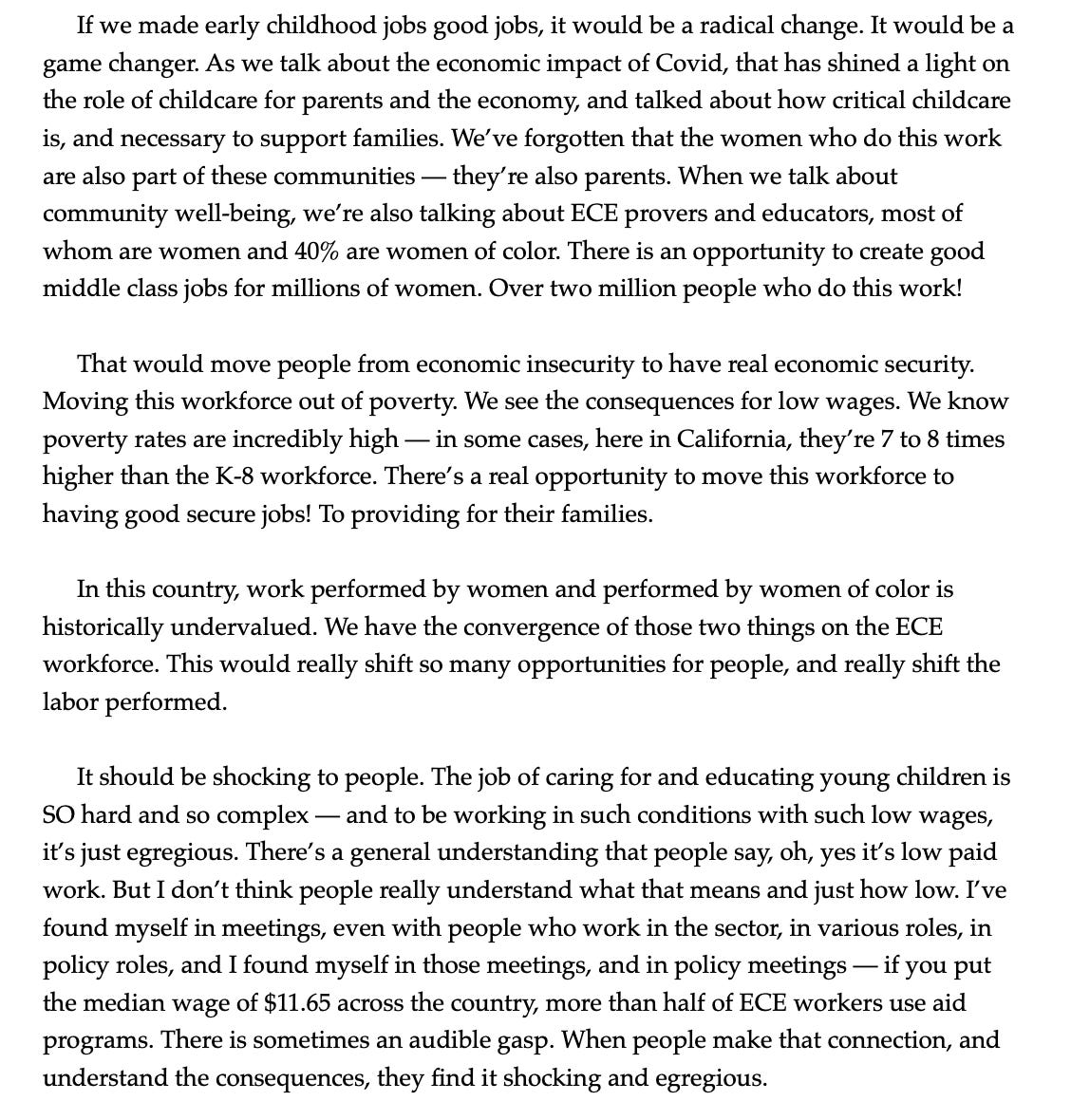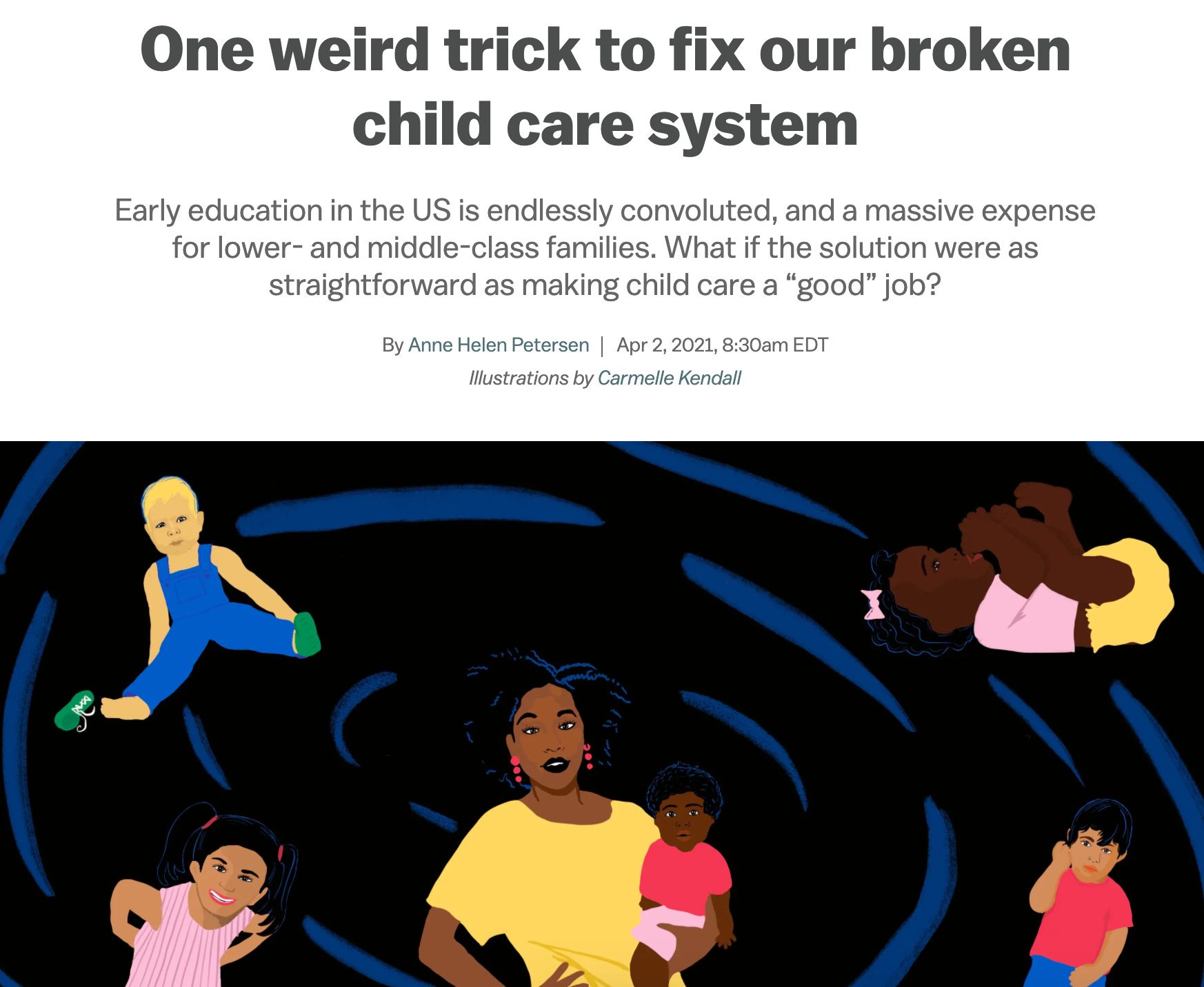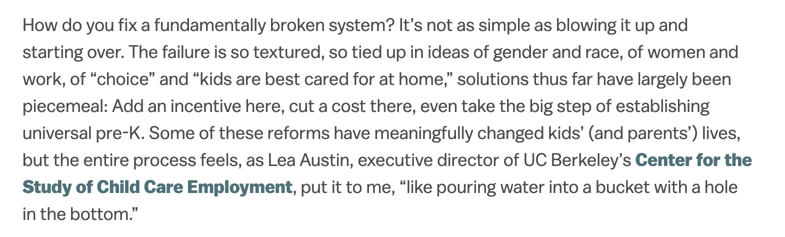 Instead, the piece begins with the understanding that the current system is broken — which, believe it or not, is an opinion unto itself, despite reams of reporting to that effect — and then asks: If it’s broken, and people are suffering because of it, how do we fix that? There are more answers than what I’ve synthesized here, but the shift to thinking of early childhood care and education as a public, common good — to what Elizabeth Warren described as infrastructure — and the difficulty in making that happen….that’s what tied these conversations together.