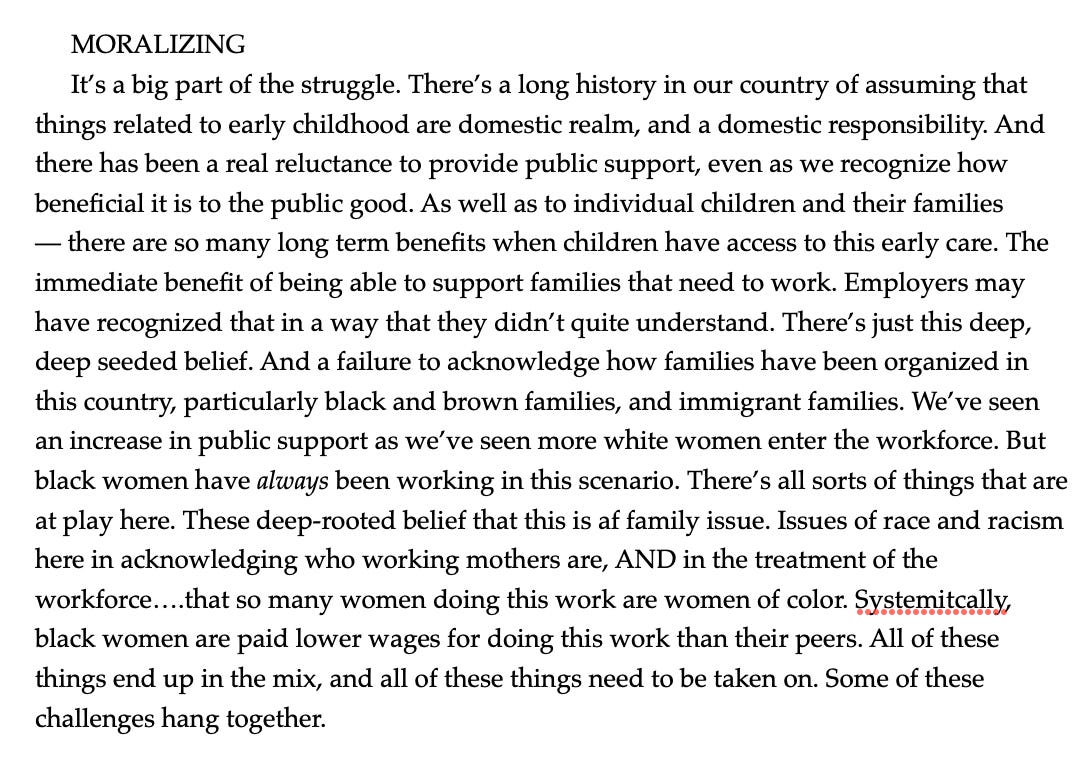 (When I’m transcribing an interview, I don’t usually write down my own questions because, well, they’re rambling and embarrassing. In this section below, I asked Austin a very rambling question about how childcare sits at this intersection of work that we assume women should be doing for free in the home, and there’s often a real moral component affixed to people who need someone else to care for their kids. Here, I remind myself that that’s how I posed the question with that sub-heading of MORALIZING, lol).