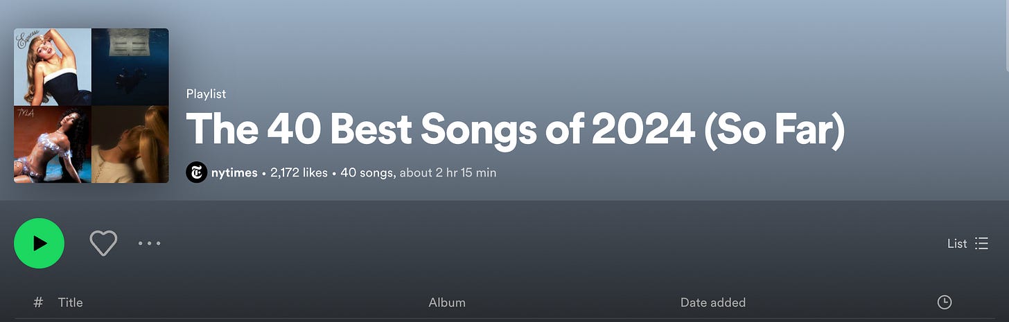 The New York Times music critics recently released their “40 Best Songs of 2024 [Thus Far]).” Whatever you think about the New York Times or their critics, I think we can agree that it’s a pretty fantastic starting point for thinking about new music and how we feel about it. Here’s a gift link and here’s a link to the Spotify Playlist (you can also click on each song in the article to listen through YouTube).