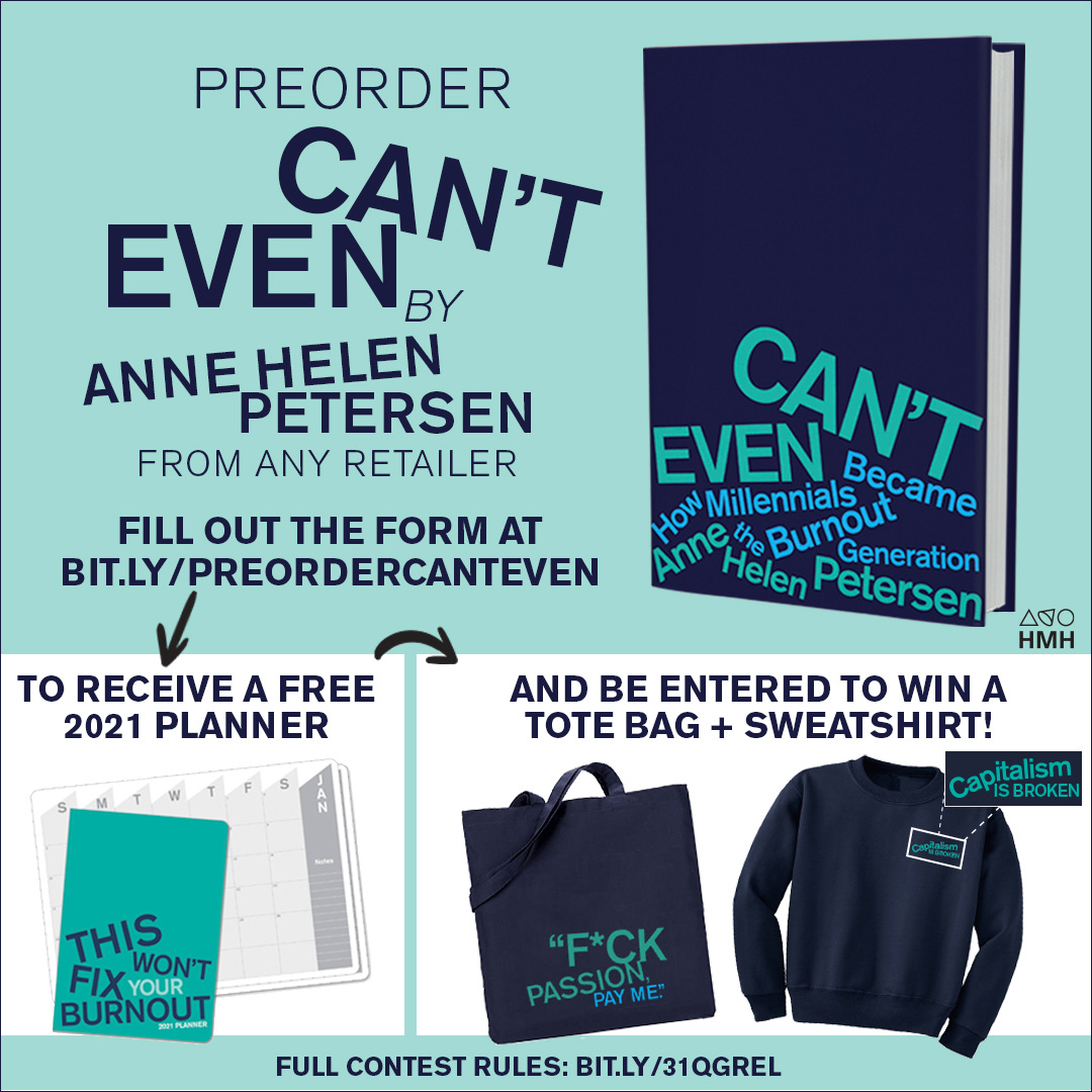 WE ARE GIVING AWAY VERY GOOD BURNOUT SWAG! Just pre-order the book from wherever you order books, then click here and enter your pre-order info. Clearly one of the ways that capitalism is broken = we’re giving away “Capitalism is Broken” sweatshirts to get you to buy this book, but guess what, they’re made with ethical labor and capitalism is broken.