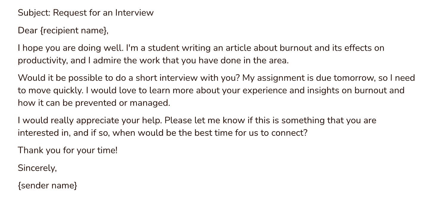 If you’re a journalist, a writer, a community leader, a local celebrity, a podcaster, a CEO, a person who’s spoken at a large or small event, a religious leader, a professor, or anyone with any sort of visibility and/or expertise, you have also been on the receiving end of these emails. Sometimes they come from high school students or undergraduates or recent graduates; sometimes they come from people who just “want to pick your brain” or network. Sometimes the end project is part of an assignment (“find an expert and interview them!”) sometimes the end project is just wanting to know more about how something works. The requests vary. But the emails themselves have something in common: they are almost always very, very bad.