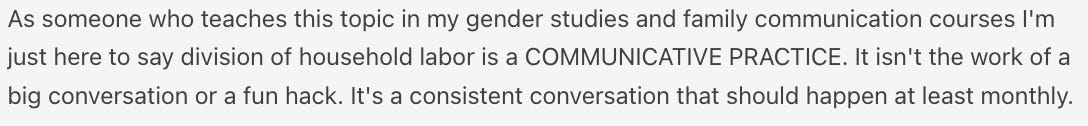 You’ll get access to the weekly Things I Read and Loved at the end of the Sunday newsletter, the massive links/recs posts, the ability to comment, and the knowledge that you’re paying for the stuff that adds value to your life. Plus, there’s the threads: like Tuesday’s on Walk-Up Songs (I have 6, don’t @ me) and Friday’s on How Does Your Household Organize Labor, which included this stellar piece of non-advice advice: