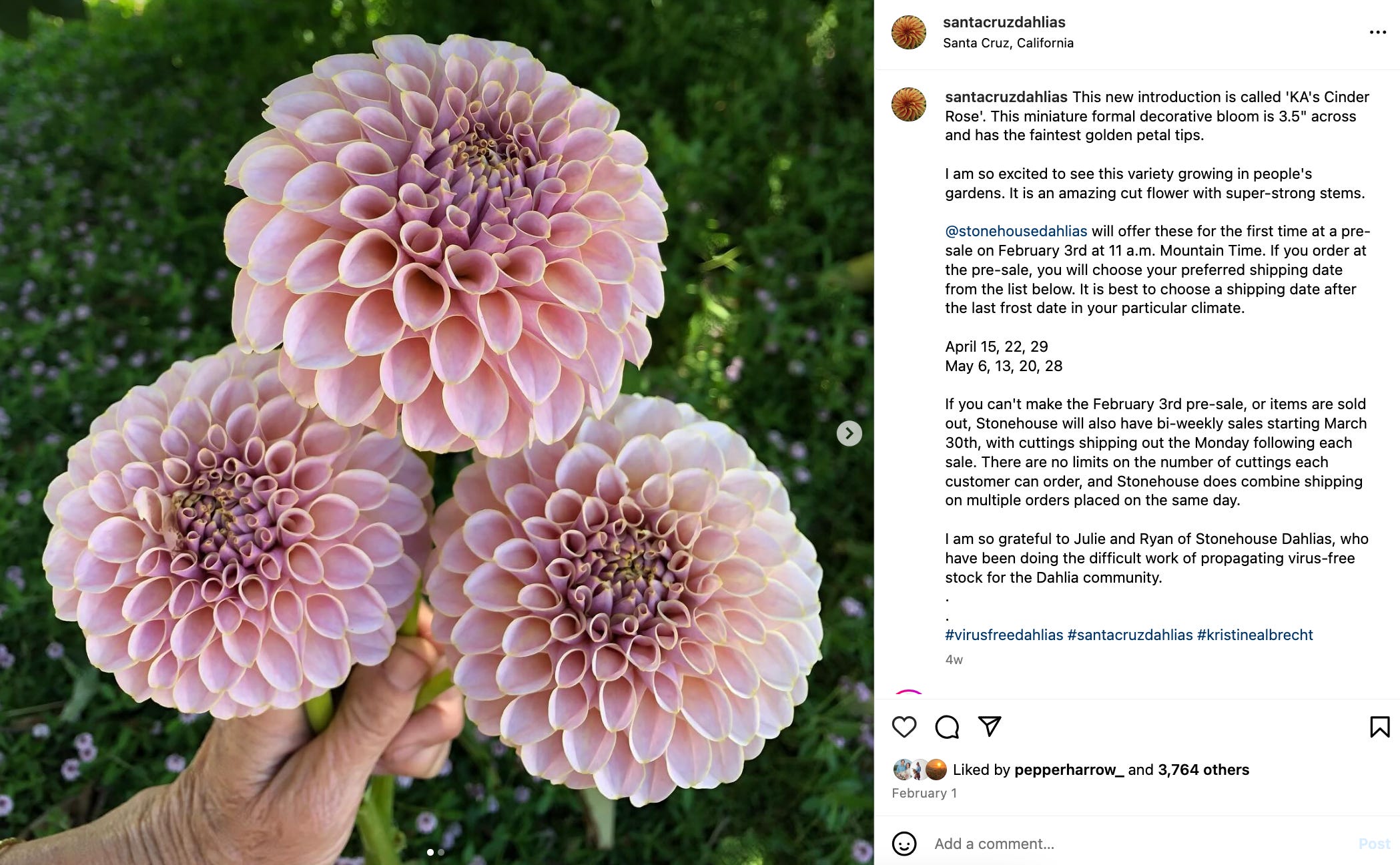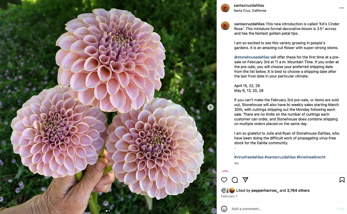 Kristine Albrecht, arguably the leading hybridizer in the dahlia world, has also figured out a strategy that works for her farm: when she introduces a new dahlia, like this year’s stunner Cinder Rose, she does it by partnering with just one or two farms. The offerings are priced “high” (a cutting of Cinder Rose went for $45 and sold out within minutes) and a portion of the sales kicks back to Albrecht’s very small urban farm in Santa Cruz — which is exclusively devoted to hybridization. I haven’t seen anyone complain about the price of any of Albrecht’s introductions — everyone knows they’re that good, and if you’re not interested, fine. People aren’t against fair compensation. It just has to make sense.