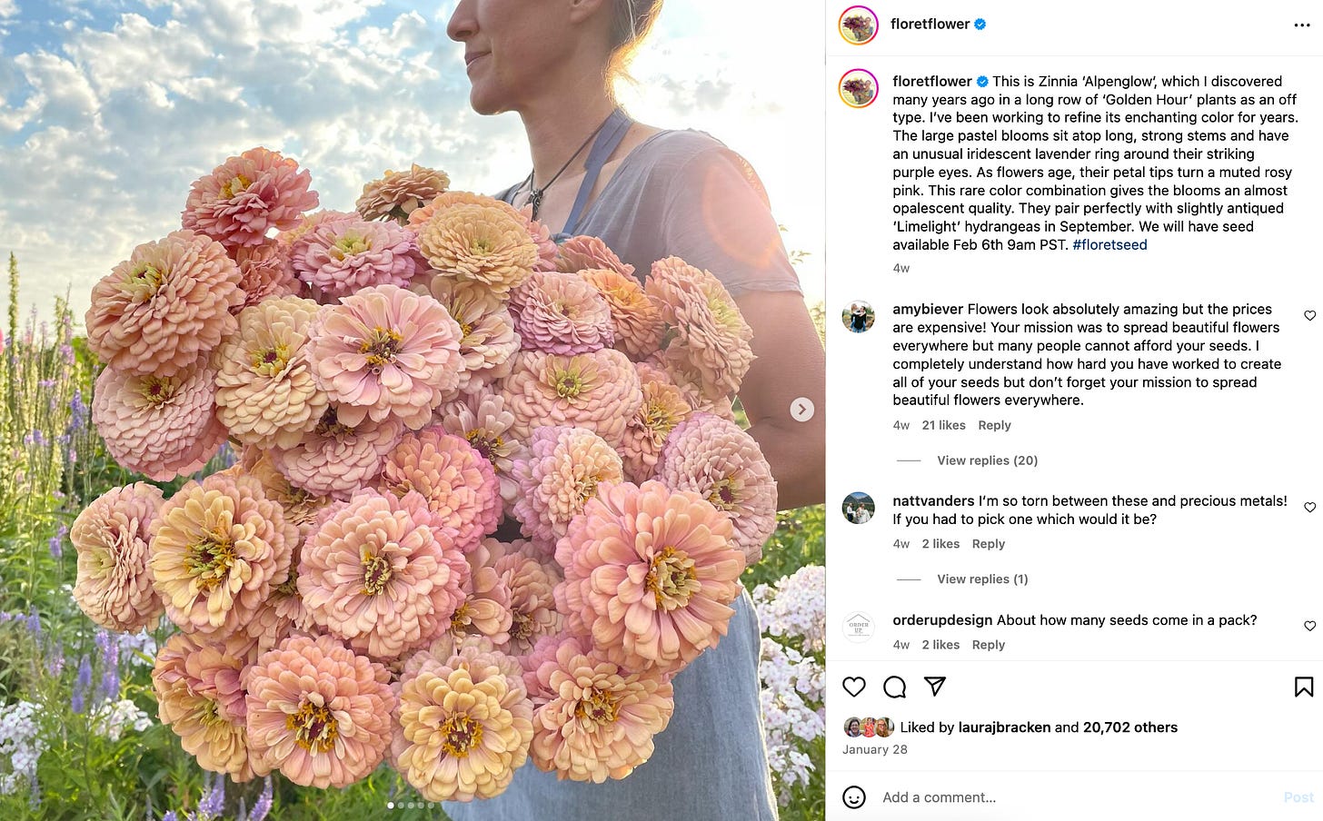 For example: earlier this month, Floret (a medium-sized seed operation headed by Erin Benzakein that was made famous, in part through Martha Stewart, in the mid-2010s….and now has a Discovery series about it) launched their much-anticipated line of Floret-bred zinnias, celosia, and dahlia seeds. These varietals are absolutely gorgeous — and, moving forward, will also be the primary source of income for the farm. One packet of the zinnia seeds costs $19.95. (For comparison, a package of zinnia seeds from most seed companies usually runs around $3-5).