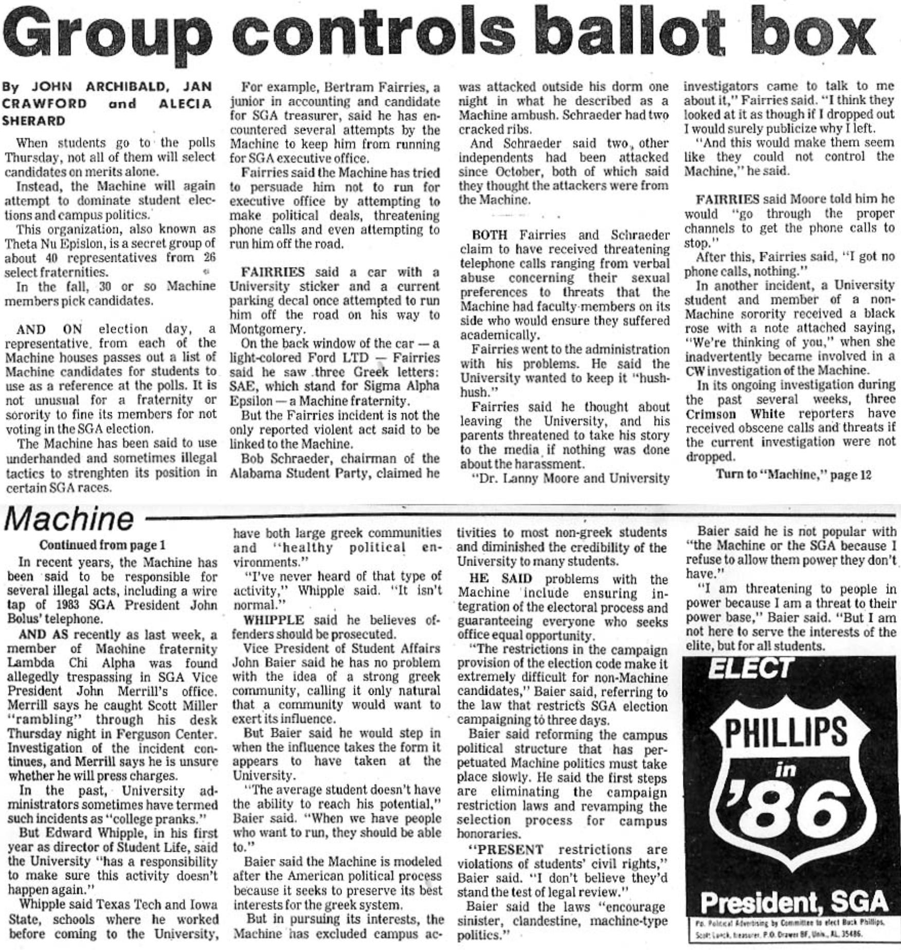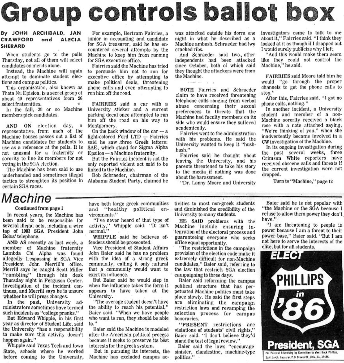When Fairries got back to campus, he complained to the administration — and sat down with John Archibald for an interview. Fairries said he concluded, based on the University’s inaction, that they wanted to keep the whole driving incident “hush-hush.” That article also included the story of Bob Schraeder, chairman of the Alabama Student Party, who had been attacked outside his dorm by who he claimed were Machine members, and ended up with two cracked ribs. John reported that at least two other independents had been ambushed in previous months; both thought the attackers were from the Machine. Someone had broken into the office of an independent candidate for SGA president. Everyone was convinced that the Machine was behind the attacks and break-ins — but couldn’t prove it.