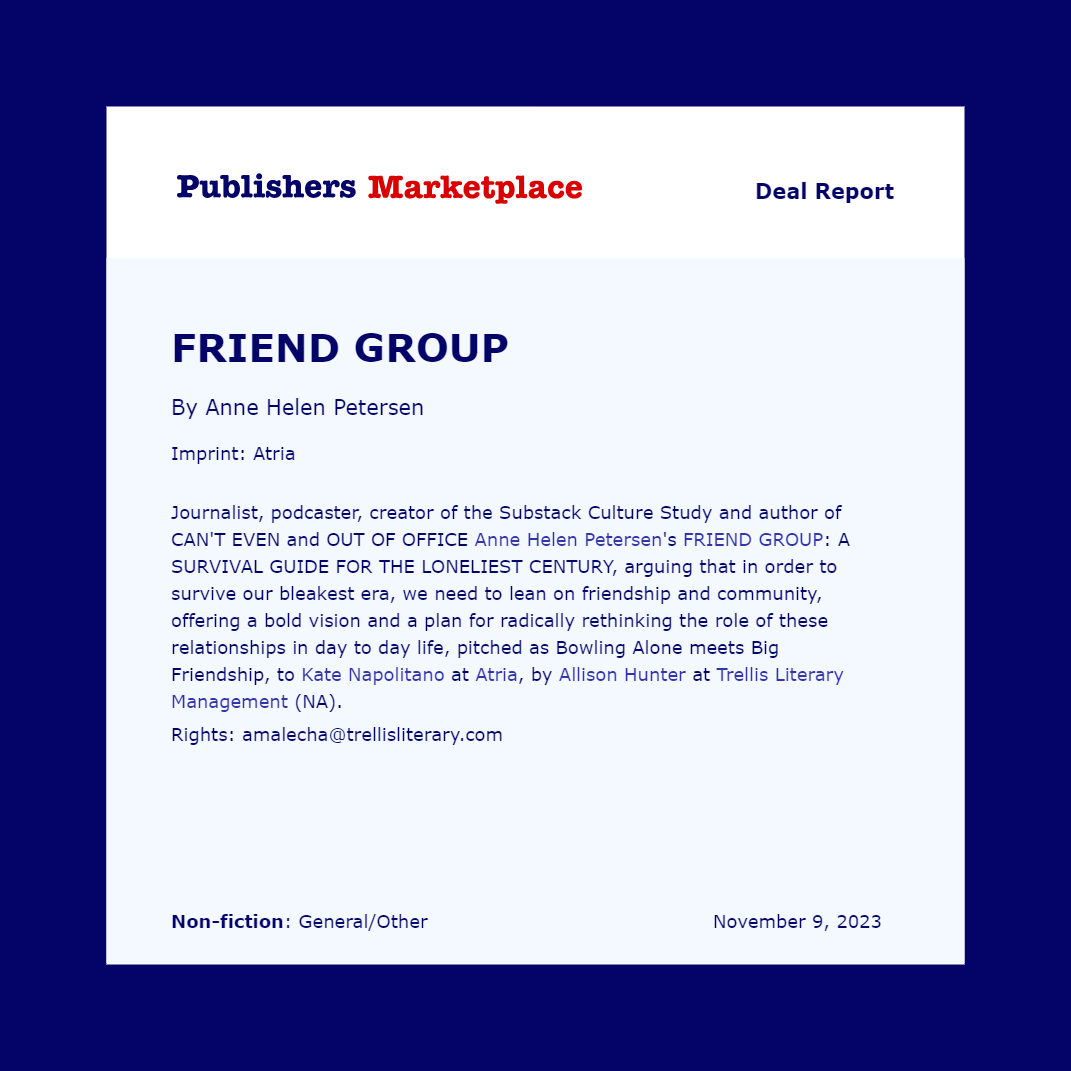 I wanted to send a quick, totally abnormal Thursday morning email to tell you about the new book I’m working on — which is very much the result of conversations we’ve had here. It’s called FRIEND GROUP: A SURVIVAL GUIDE FOR THE LONELIEST CENTURY. I’m going to focus on 1) how we got here and why it feels the way it does but, more importantly, 2) how we can make the big and small decisions to foster community and friendship….and create the sort of care and intimacy you’ve been looking for. If you need it and crave it like I do, I want us to work together to figure out how to make it happen.