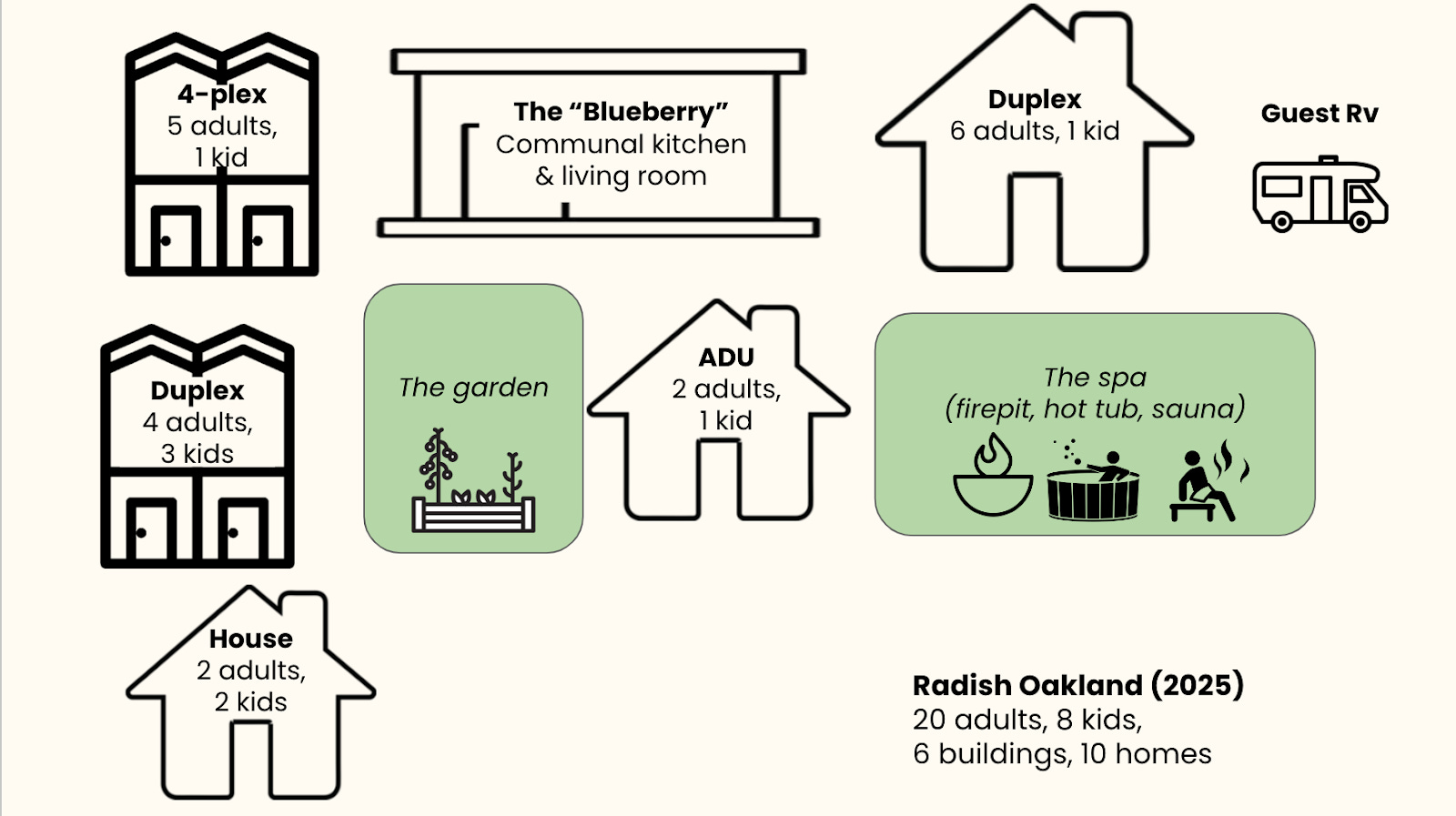 As our life stage changed — marriage, kids, no longer tolerating shared bathrooms — we built new living arrangements. Our current home is Radish in Oakland, a cluster of 10 homes, 20 adults, and eight kids under the age of four. We share meals, childcare, and a big yard, while still having our own private homes.