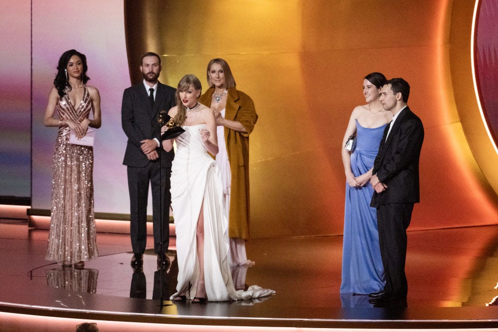 Swift was nominated for six Grammy awards. She won Album of the Year for Midnights, making her the first artist to win the award four times — a historic achievement, and I understand why people are upset that it’s been overshadowed by other discourse. We’ll get to that in a moment, but first we should situate her win within the rest of this particular Grammys broadcast.
