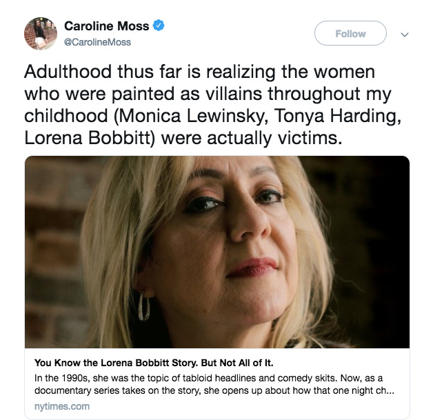 There will be more survivors, for lack of a better word, of postfeminism for us to reflect on. Britney, just to start. The treatment of Serena Williams, for sure. But I fear what current cultural events, what treatment of cultural icons, will return to us in twenty years. Just because feminism is cool again doesn’t mean postfeminism is dead, or anti-feminism isn’t just alive, but thriving. I refuse to believe that we’ve always treated people unfairly, and will continue to. We might always get things wrong. But think, for a moment, about who we get the most wrong — and whose treatment, if revised, it’s to acknowledge that they were treated too well. And those people? They very rarely have anything in common with someone like Lorena Bobbitt.