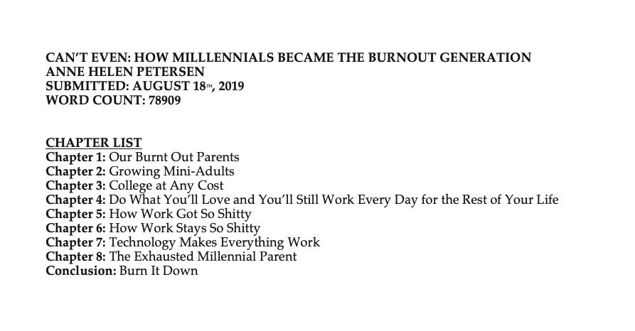 That’s the first draft of the book, just submitted. I’m leaving the country and the internet for the next two weeks, but I wanted to thank all of you who contributed to this in some way — by filling out the various burn out surveys, or sending me articles of note, or telling me about your own understanding of your parents’ workaholism. You’ve already made it better, and I truly mean that.