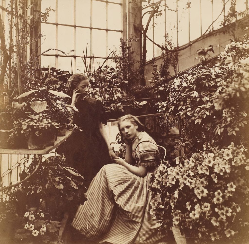 Over the next century, ornamental plants became a fixture in the middle-class home — mignotte plants, used to mask scents within and outside of the home, on specially made pans; forced crocuses in clever little pots; umbrella plants as close to the fireplace as possible, and terrariums of various sizes. In poorer neighborhoods, scarlet geraniums were a regular feature of the windowsill; in richer ones, conservatories (and green houses) like the ones from Age of Innocence became increasingly popular. (Wharton describes Buford’s conservatory as a place where “camellias and tree ferns arched their costly foliage over seats of black and gold bamboo.”) Sometimes these spaces were maintained by servants and the same gardeners who attended to outdoor garden spaces, but unlike outdoor garden design — which had historically been considered the provenance of men — interior plant design was “women’s work.”