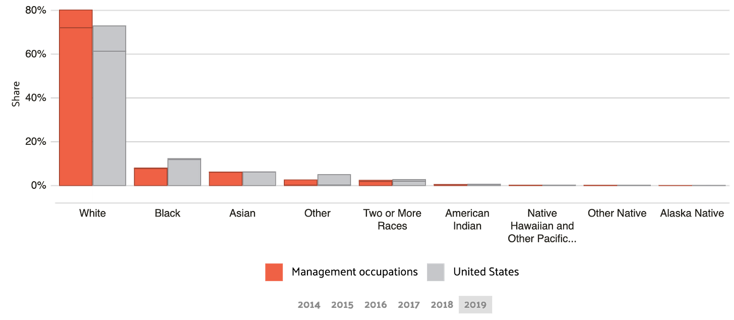In this scenario, people who prefer to work remotely, and on more flexible schedules, will form a secondary class of worker — and that secondary class will be filled with the same people who have fewer privileges within the current social hierarchy, especially if the managerial class continues to reproduce its racial dynamics. (In the chart below, the block on the top of the chart represents “White Hispanic” — which makes up 8.8% of the managerial class. White Non-Hispanics account for 72%. More data here).