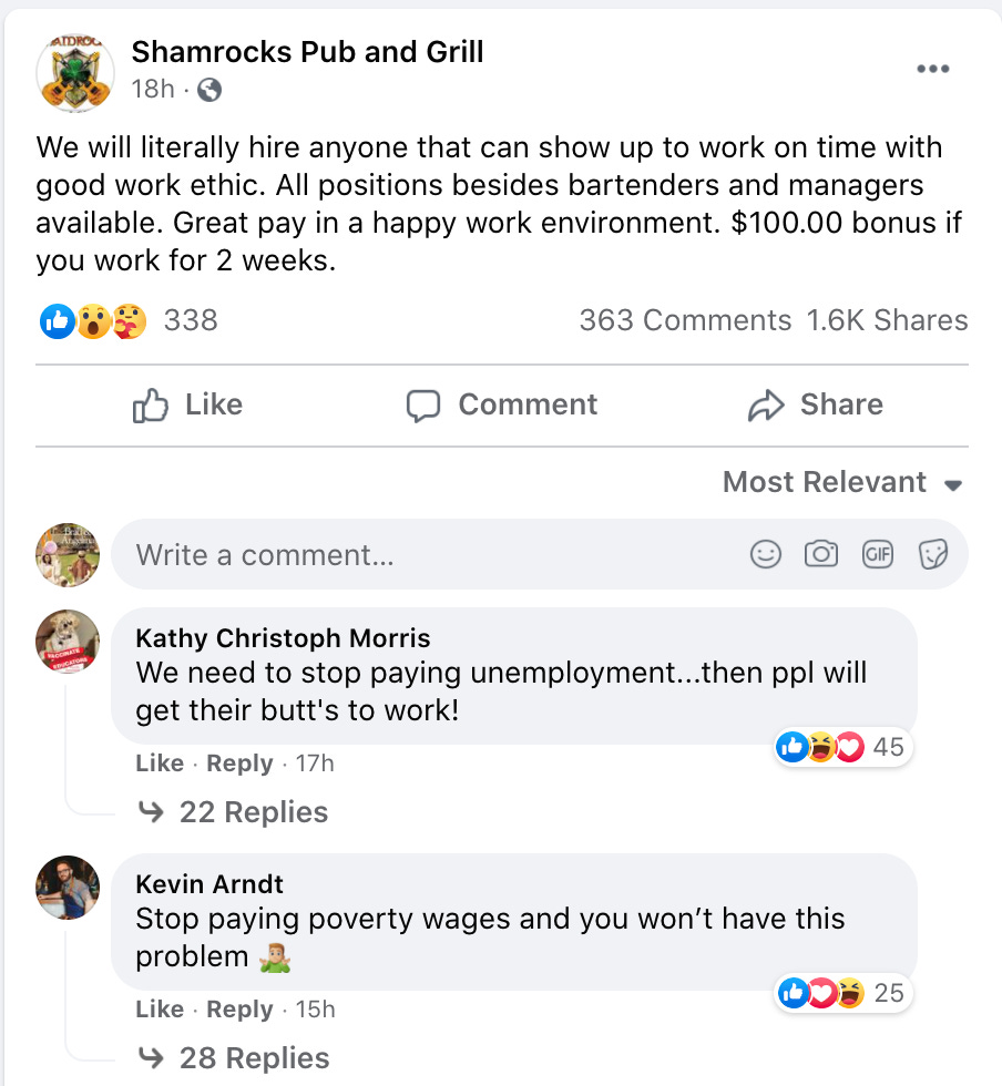 Some of these unfillable jobs are in places without affordable housing — or, like Missoula, where cost of living has continued to rise over the course of the pandemic. Others are seasonal and/or tourist-adjacent. Many are at restaurants, particularly fast-food. Some are at retail stores with unpredictable scheduling. What goes unsaid in many of these stories is the fact that the jobs are shit jobs, whether because of the unsustainability of the pay, the Covid exposure, or the shit treatment they’ll receive from tourists.