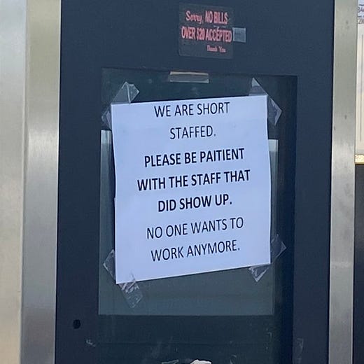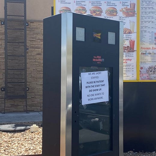 Some of these unfillable jobs are in places without affordable housing — or, like Missoula, where cost of living has continued to rise over the course of the pandemic. Others are seasonal and/or tourist-adjacent. Many are at restaurants, particularly fast-food. Some are at retail stores with unpredictable scheduling. What goes unsaid in many of these stories is the fact that the jobs are shit jobs, whether because of the unsustainability of the pay, the Covid exposure, or the shit treatment they’ll receive from tourists.