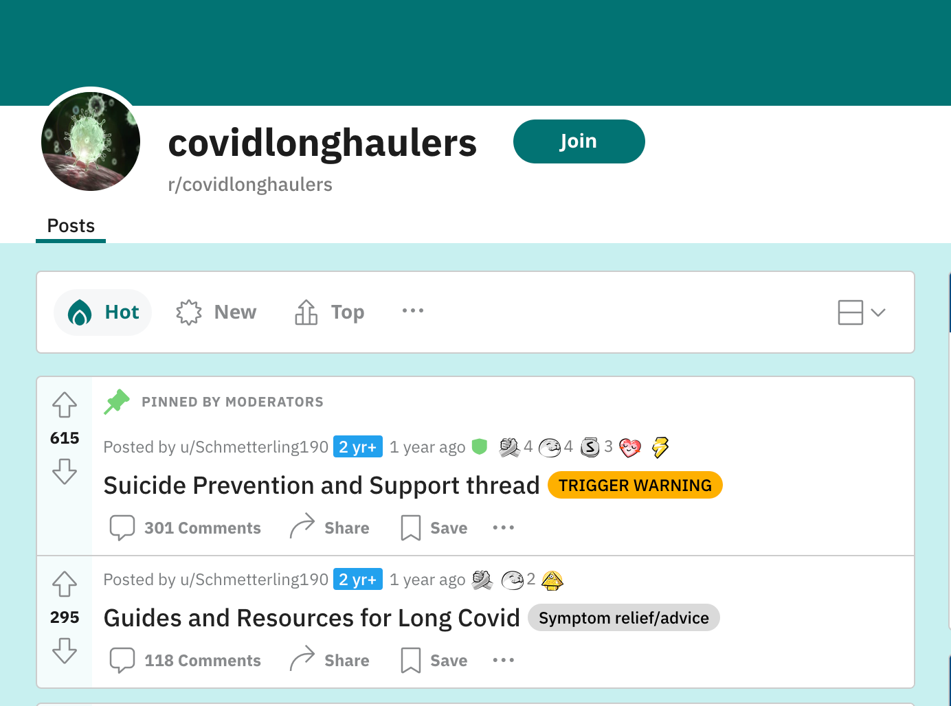 The TL;DR: people are really suffering, and most don’t have the energy/bandwidth to push their medical providers to help them and/or they don’t have medical care (they don’t have a PCP [primary care provider]; don’t have insurance; don’t know how to get medical care; don’t understand how insurance works; doctors gaslit them….or the individual believes that illnesses just go away on their own). They’re turning to these online groups for advice, but because these groups are full of people that also don’t know what they’re doing, it is a hotbed for misinformation and the propagation of snake oil and sometimes risky behaviors. But these people have nowhere else to turn. So while long covid communities have much in common with other health communities and general online communities, there are few aspects that make them different.