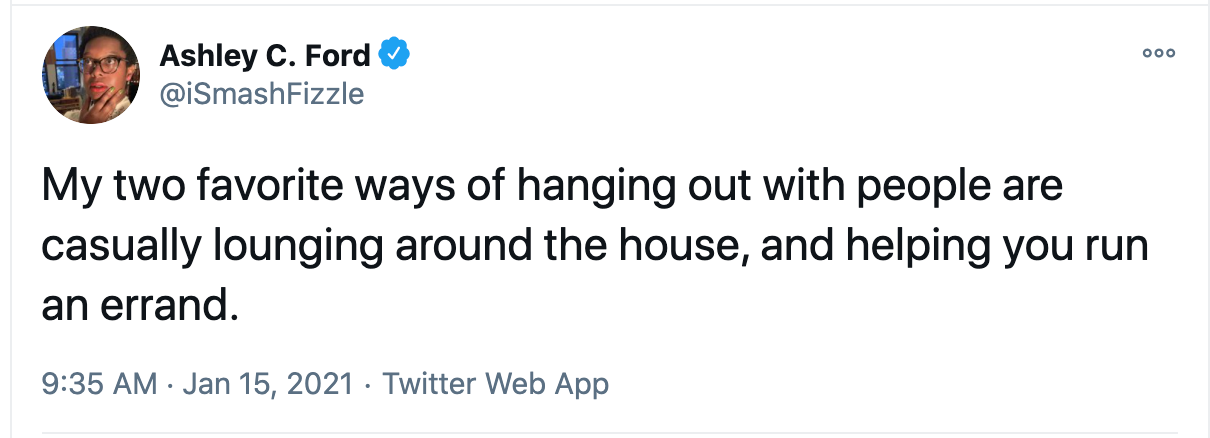 I think this sort of friendship is often gendered: women stereotypically do a lot of errands and housework; women love to just hang out and chat. But men do this too, they just do it with sports in the background. Those hangouts are somewhat more appointment based, but when there’s three football games on over the course of a day, you can kinda just agree to show up. Same with playing golf: oh, you wanna just spend like four hours walking and talking??? You know what? Men also love to hang out and talk. Intimacy is for everyone.
