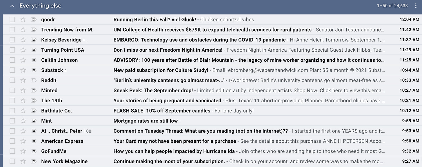 This is after I spent a solid two hours last month deliberately unsubscribing from a number of emails, and after Gmail prompted me every few weeks to unsubscribe from senders whose emails I never open, and after I made liberal use of the “Mark as spam & unsubscribe” button, the efficacy of which, I know, is limited. Point is: I’m trying to bring the stew to a simmer, but the temperature keeps rising. (And yes, there’s a Talking Points USA email in there, when you report on weird things you sometimes subscribe to weird things).