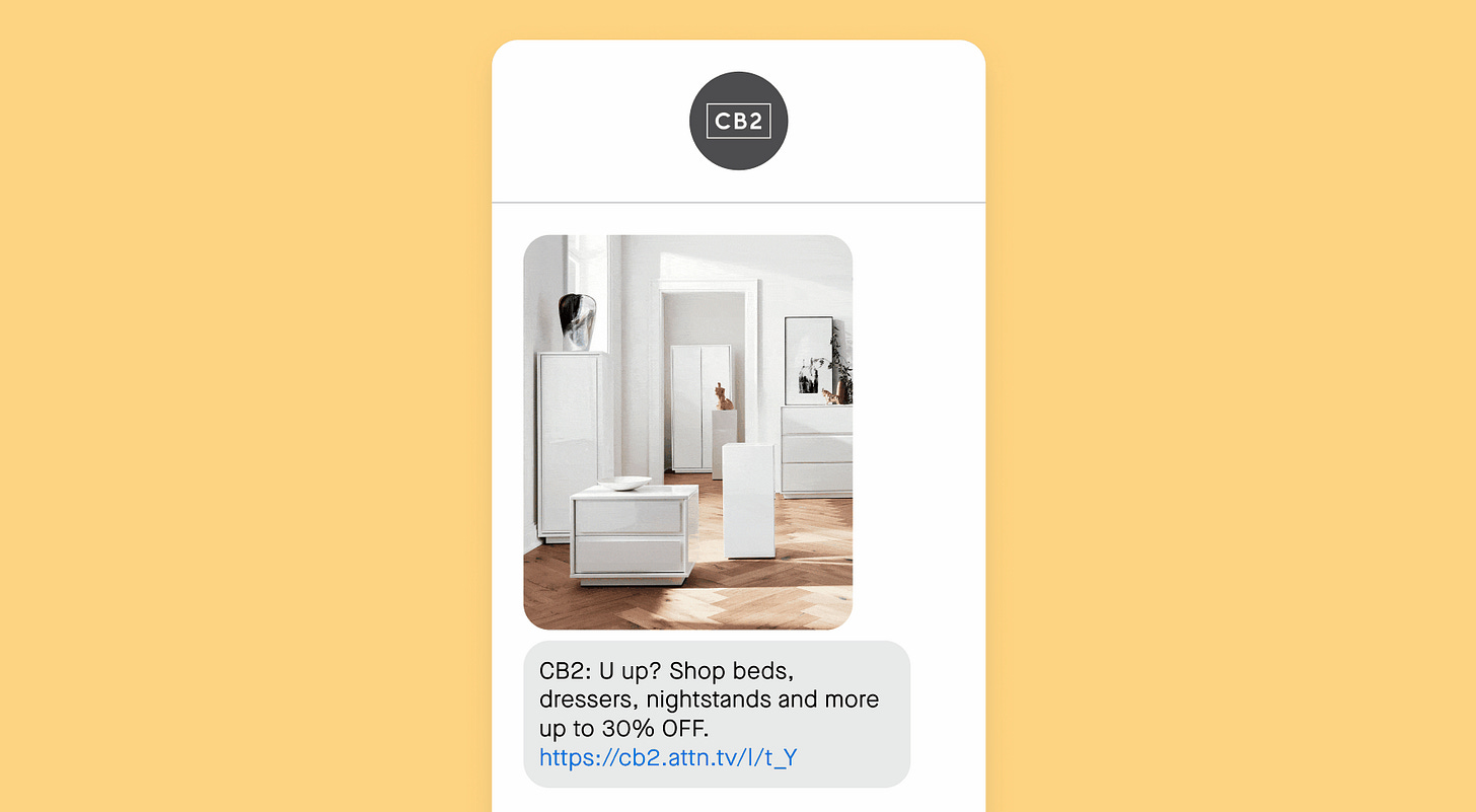 That’s not accidental. When furniture company CB2 decided to start experimenting with SMS marketing, they wanted to approximate the “natural, conversational tone of text messaging,” while matching their “strong brand voice — fun but elevated and edgy.” One of their first messages started with “U up?” followed by….a link to a sale for 30% off. The click-through rate was higher than other messages with a more traditional tone, which, according to Phillip Cruickshank, associate director of brand marketing at the company, “proved to us that we needed to speak to customers differently on this channel.”