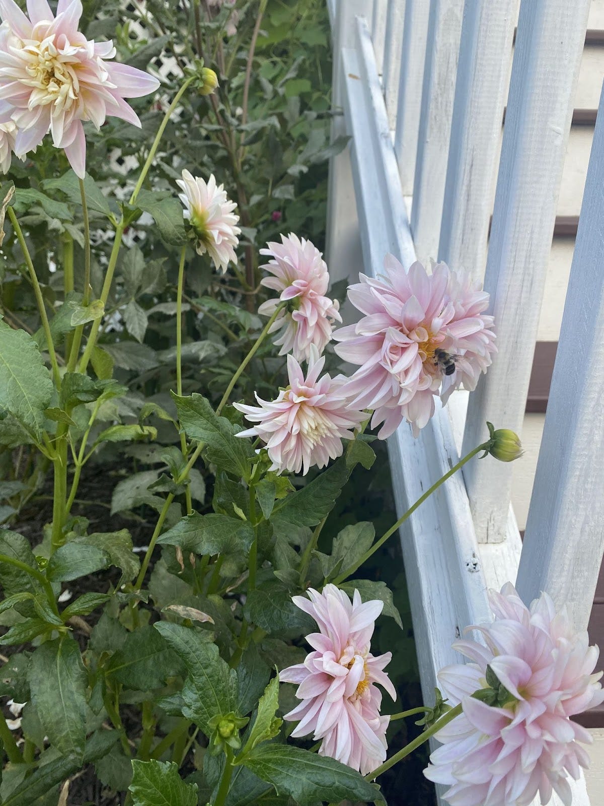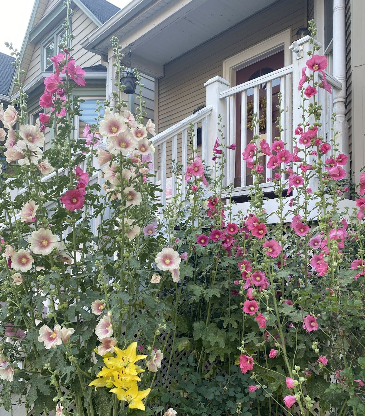 I’m obsessed with the hollyhocks in the front of our house. I started from a seed packet in the Fall of 2021 and was rewarded with a smattering of pink hollyhocks that next Spring. I let those go to seed and this summer, I have a glorious forest of hollyhocks. They are striking because they are so tall and colorful. The bees love them so I feel like a magnanimous do-gooder. The hollyhocks are slowly taking over the front garden and I’m here for it.