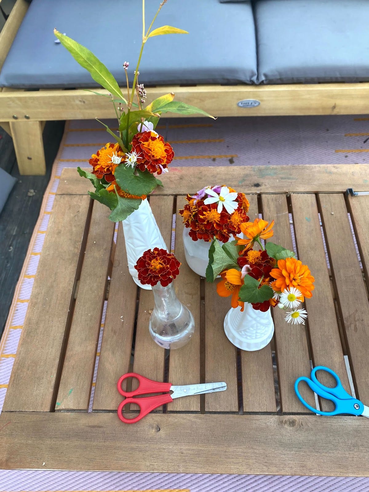 We moved into this house from a condo with no outdoor space when my daughter was four. From the beginning, I knew I wanted her to have free rein in the garden and be as involved as she wanted to be. I purposely pick plants that grow a lot of flowers – cosmos, hollyhocks, dahlias – so there are always more to come. Each Spring I put wildflower seeds in an old spice jar so she can sprinkle them out wherever she wants and feel ownership of the flowers created.