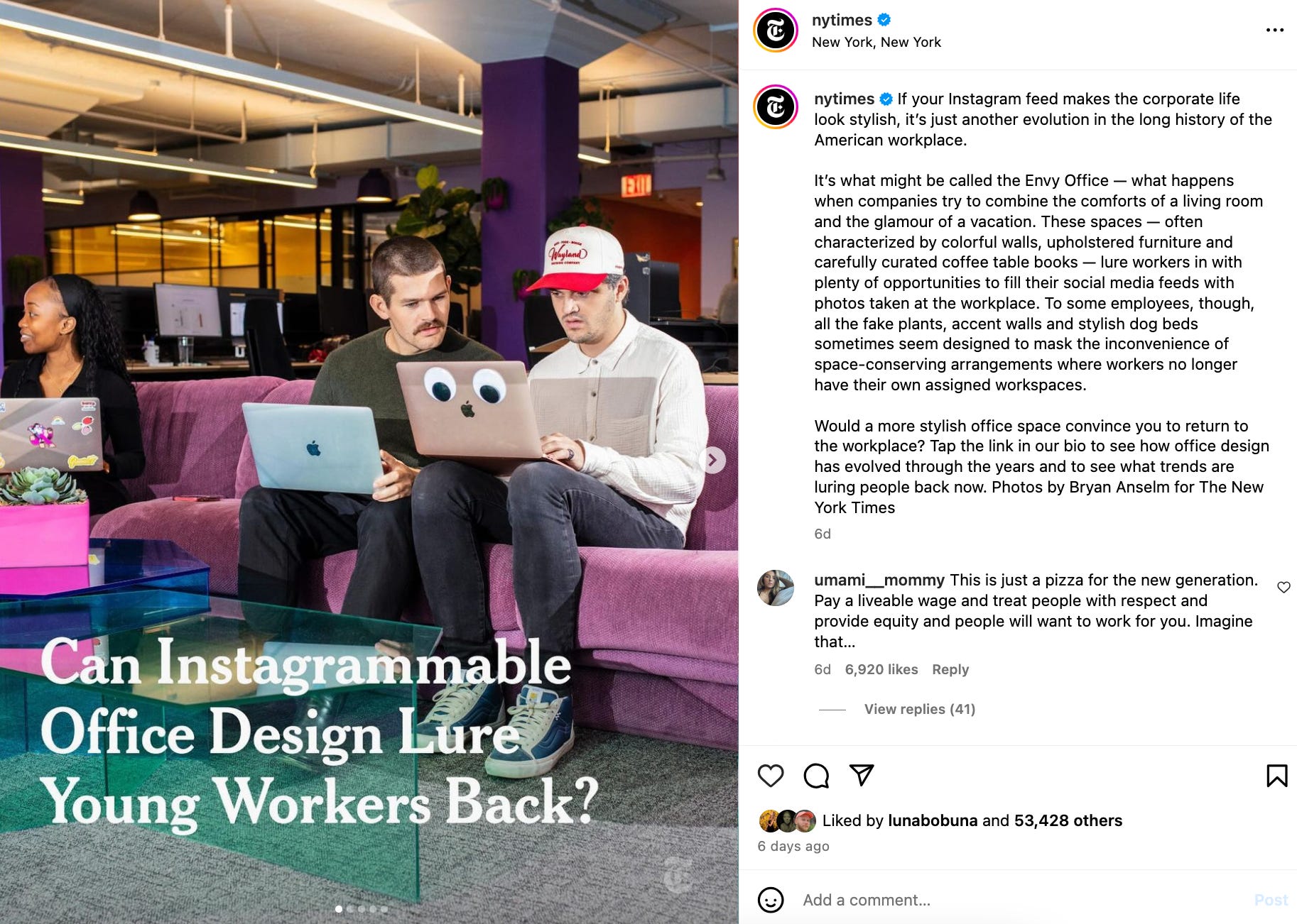 Maybe you saw it, too — a piece from the New York Times wondering “Can Instagrammable Office Design Lure Young Workers Back?”