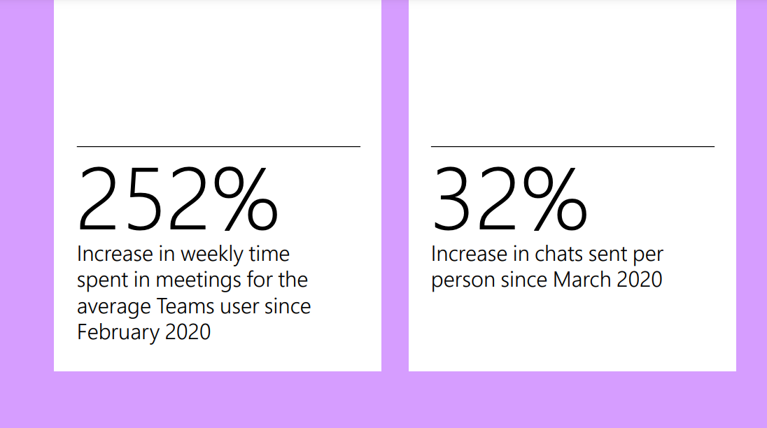 252% increase in time spent in meetings! And yes, of course, some of that increase has to do with the fact that “drive-by” interactions are a lot more difficult when not everyone’s in the office, but this meeting glut is also the result of poorly considered meetings, a culture that considers meetings to be the clearest sign of productivity and engagement, micro-management, and general workplace FOMO. (What if someone talks to someone else about a project you’re working on and you’re not in the meeting? Did you ever even complete the project at all?)