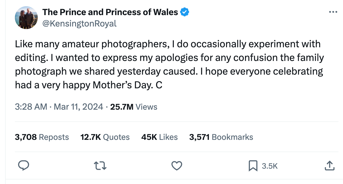 There have always been royal rumors and royal blind items and royal scandal-mongering in the tabloids — but the decline of press authority, the AI-facilitated understanding that seemingly “authentic” images can not only be manipulated but created out of whole cloth, and the plummeting trust in public institutions…..these forces collide and feed skepticism of any narrative released or touched by the monarchy. (For a smart take on this line of thinking, read more from my partner, Charlie Warzel, here)
