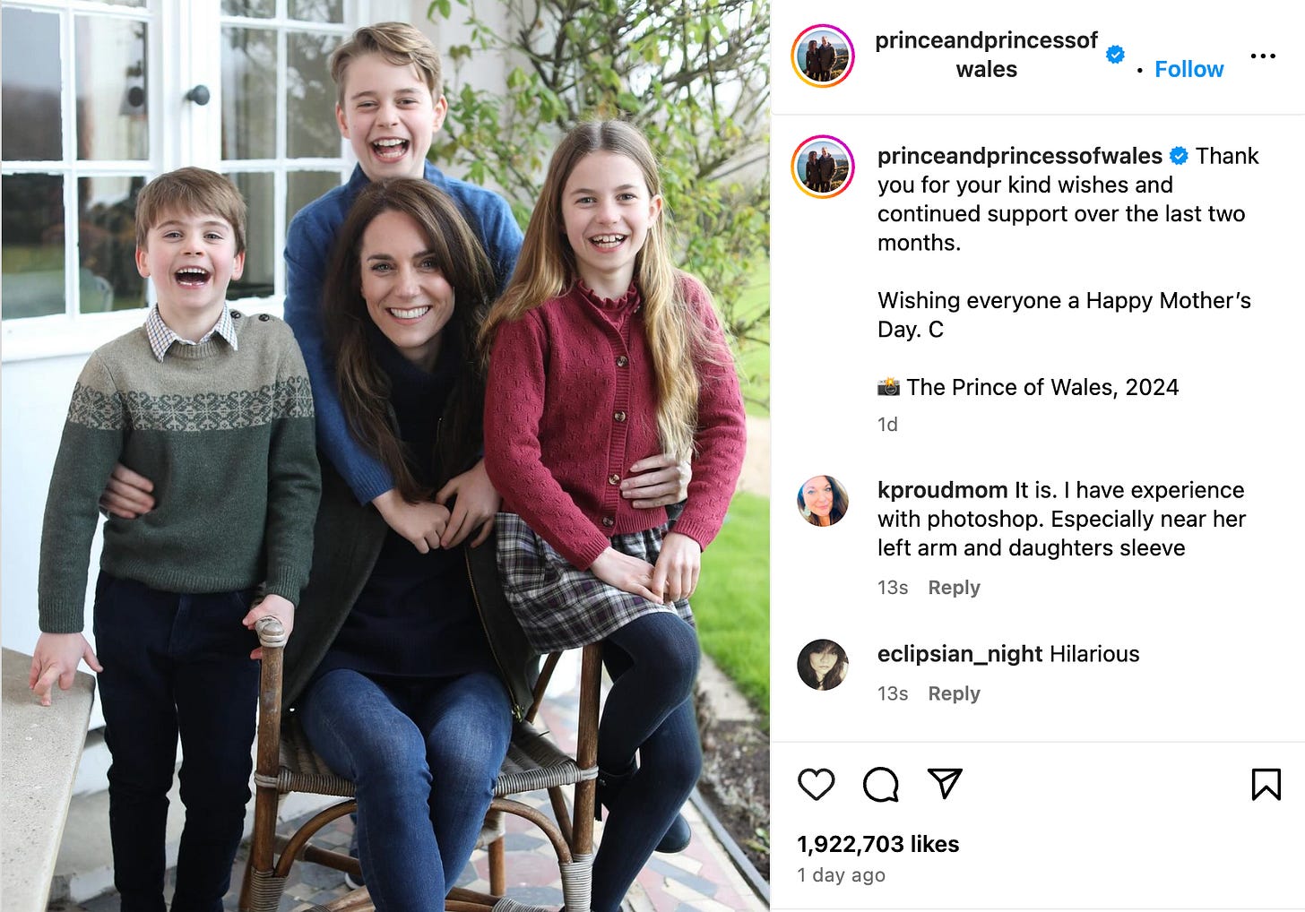 The conspiracy train immediately began scrutinizing the photo, picking up on several telltale signs of Photoshop and digital manipulation. The AP issued a (very rare) “kill notice” alerting organizations not to use the photo; other photo agencies quickly followed suit. On X, the palace (tweeting as “C”) “apologies” for the confusion caused by her “experiment” as an “amateur photographer.”
