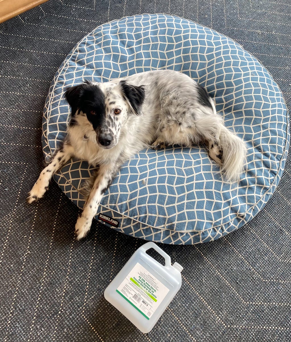 At 4 pm, I started drinking what’s called “the prep.” The prep is a mix of stuff that makes you poop and keep pooping until there is no poop left in the twists and turns of your colon so that the butt camera can get in there and take a good look around. There are several types of prep and seemingly little standardization in the type that a given person receives. Some people get two pills and a small amount of liquid to drink. Some people just get a small amount of liquid to be consumed in two parts. Under my insurance, that smaller amount of liquid would’ve cost $100, so I opted for the generic, which is the big gallon jug you see next to my dog Steve in the photo above. Some people really, really dislike the taste (it seems like it used to taste much worse even just ten years ago); mine had a lemon-flavored additive that made it taste something akin to lemony sweaty gym socks.