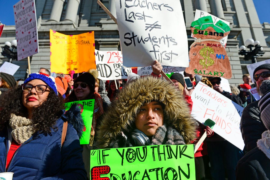 Which is bullshit, of course. As Santoro writes, “our current predicament has many teachers running on empty, even those with good boundaries and solid self-care practices.” What educators are feeling right now — what they’ve felt over the last year — is not just frustration and fear inspired by the pandemic. It’s not just burnout. It’s way beyond that. It’s chronic burnout and deep demoralization as their labor is increasingly under-funded, under-valued, and under-resourced.