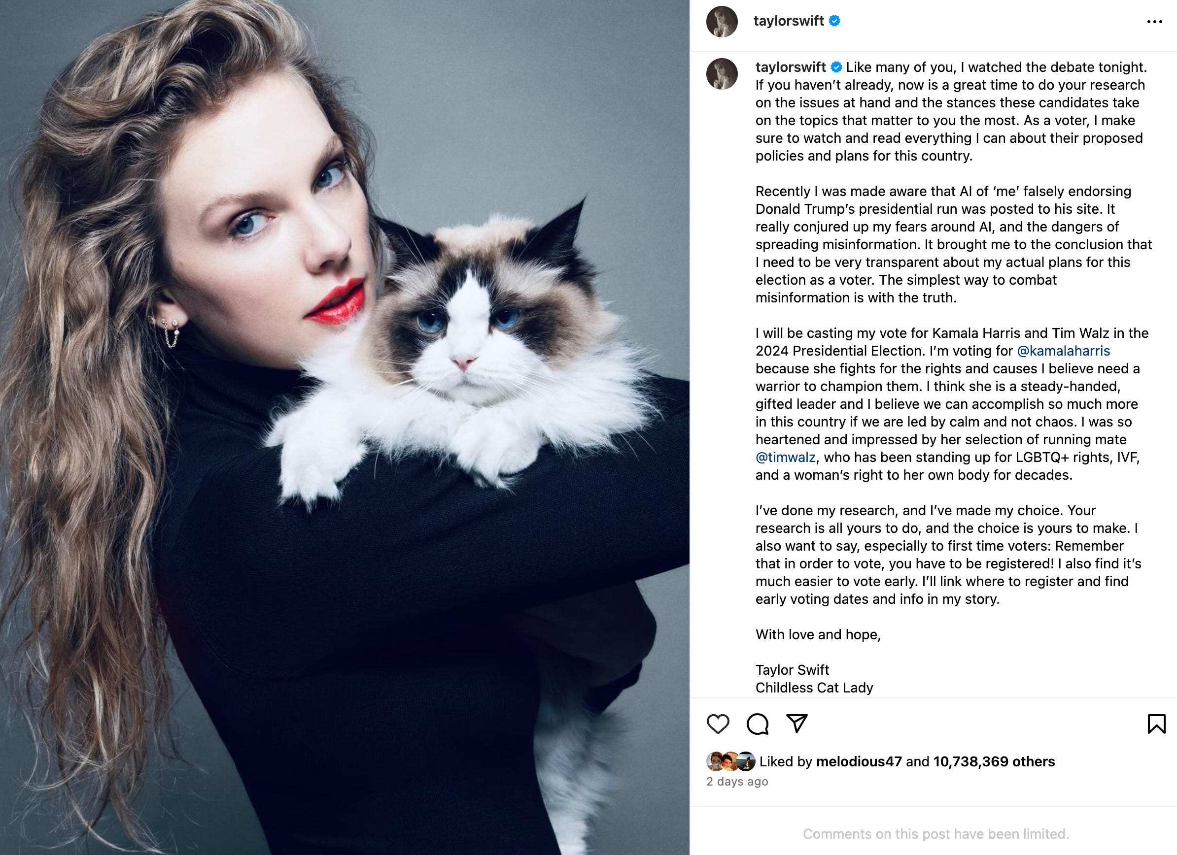 From a PR perspective, this is masterful. The timing, the cat, the AI bit, the reference to her own research and specific policies that matter to her, the link to register, all of it. Some argued that this declaration jeopardizes her career, but some people are delusional. Fans already knew her politics. This changes nothing in that regard. Getting people registered to vote is powerful; so is activating (even more) fan energy around the Harris campaign (even before the announcement, Swifties for Change had raised more than $163,000 for Harris).