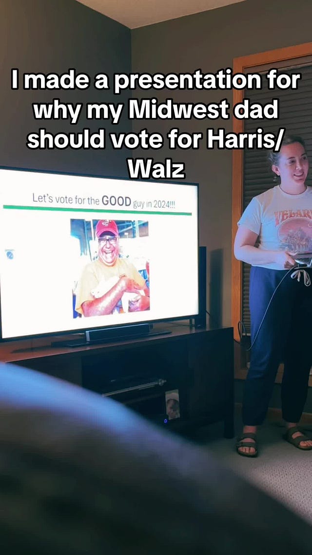Awkward! Bad! So much potential to come off as self-righteous and preachy! But we know people don’t change their political minds because of ads or speeches. They change them — often very gradually — through conversations. Or very targeted slideshows for your Midwestern Dad, like the one in the TikTok above.