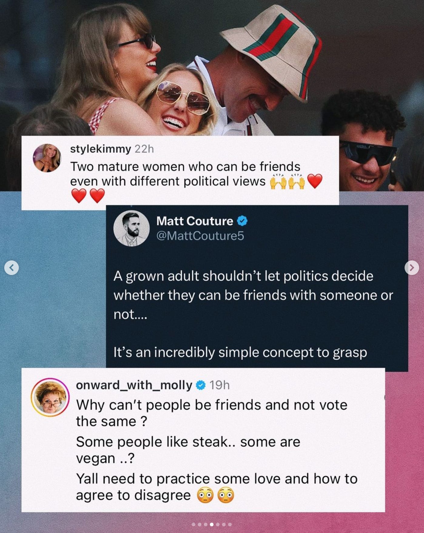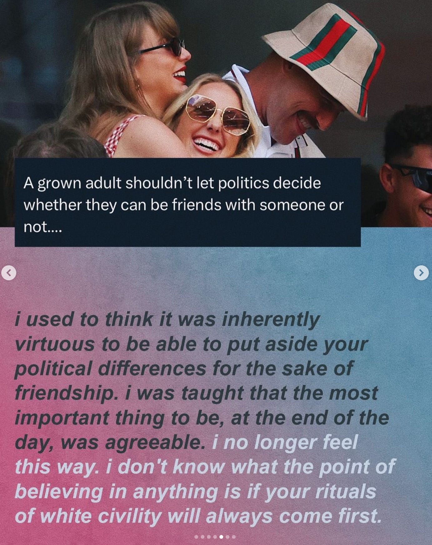 Is Taylor Swift having these conversations with Brittany Mahomes? I dunno! Should she? If they’re actually friends, I think so. In fact, the way someone reacts to your attempt to humanize other people who matter to you might clarify whether you actually want to remain friends with them.