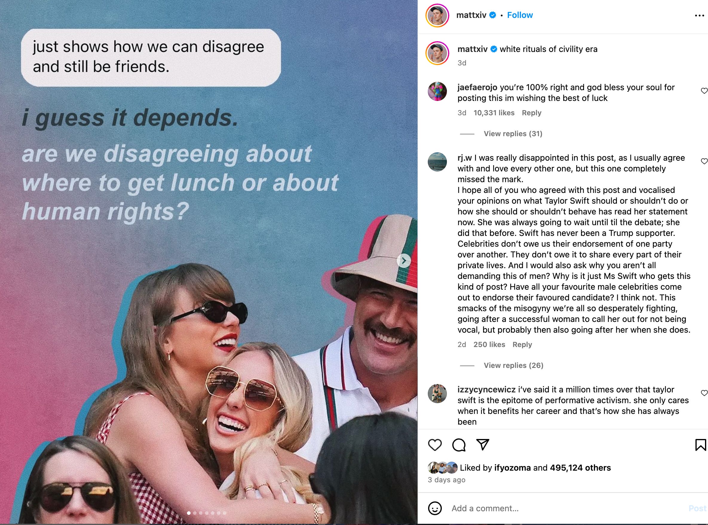 Earlier this week, Matt Bernstein — better known as mattxiv, podcaster and tremendously successful meme/slideshow creator — posted a series of slides to his Instagram with the caption “white rituals of civility era.”