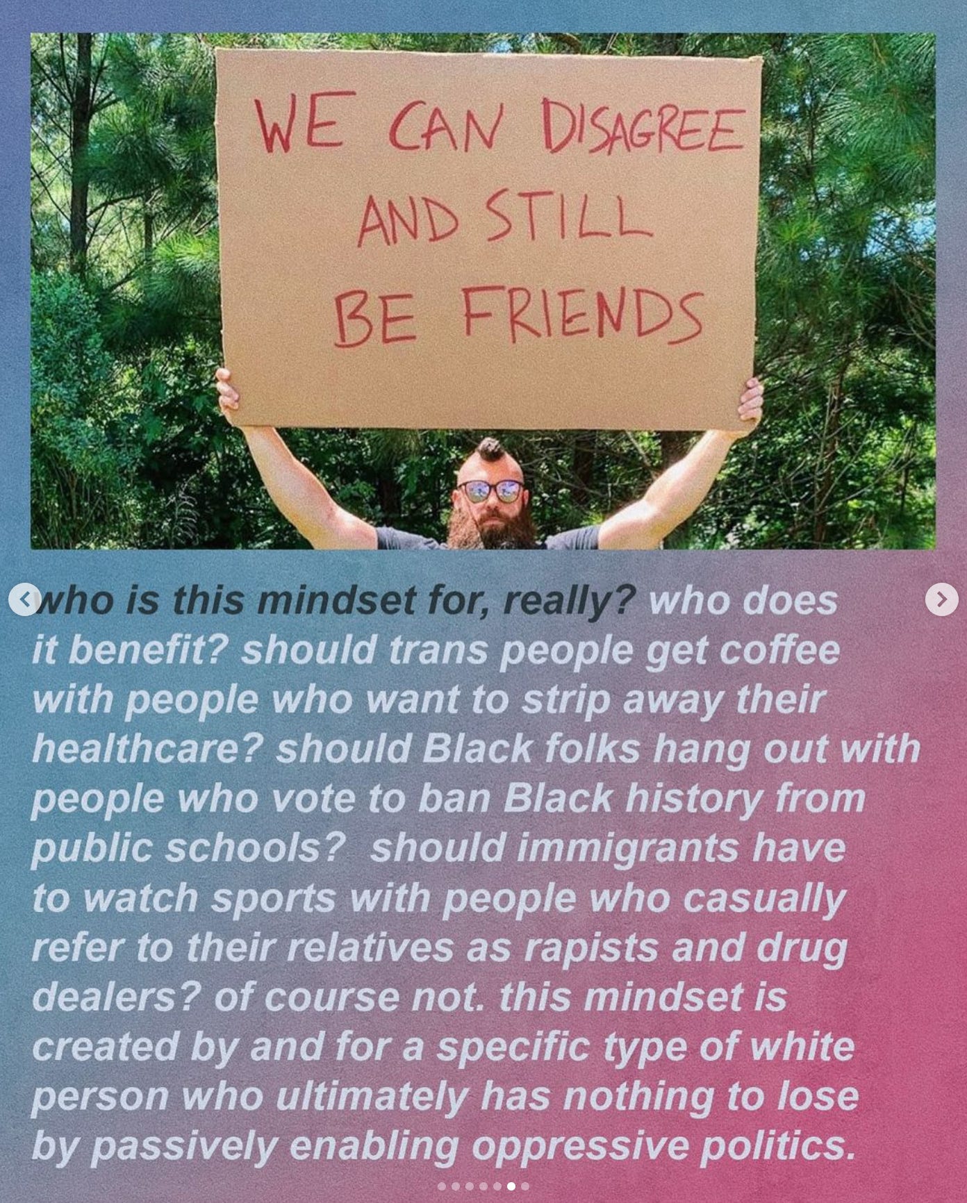 What that argument misses is how societal power insulates both members of this theoretical friendship from the consequences of Trump’s politics. The stakes, in other words, are very low. Why blow up a friendship, cause a riff, make a scene over something that doesn’t personally affect you? But instead of acknowledging that insulation, you come up with a narrative that valorizes civility. This is what Bernstein invokes so well in the slideshow: the mindset that “is created by and for a specific type of white person who ultimately has nothing to lose by passively enabling oppressive politics.”